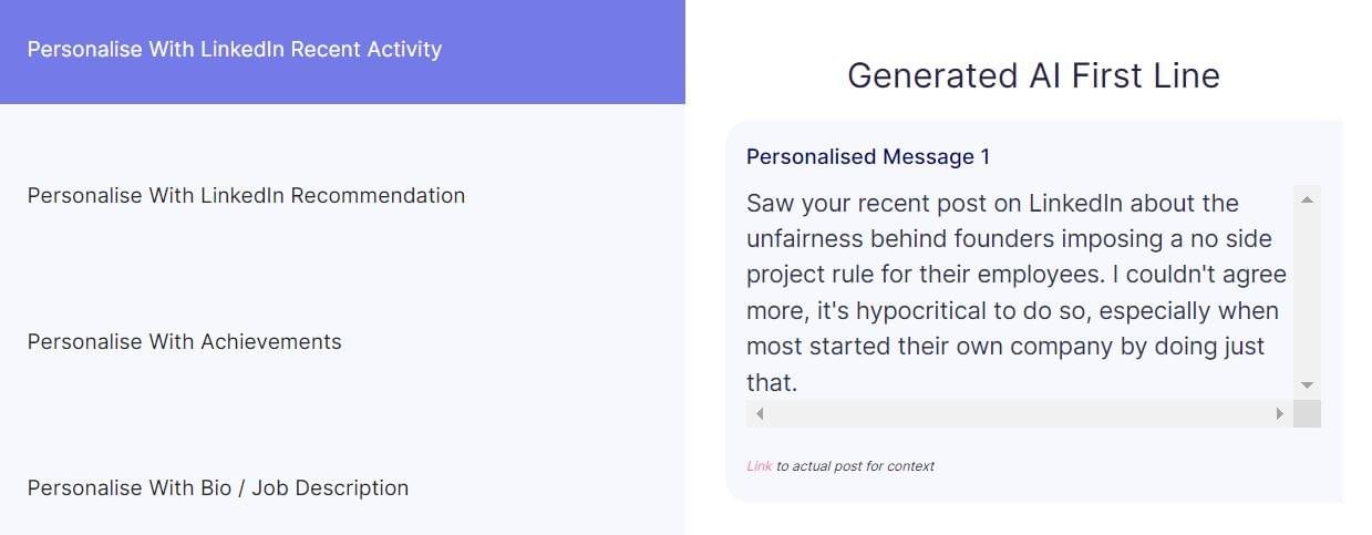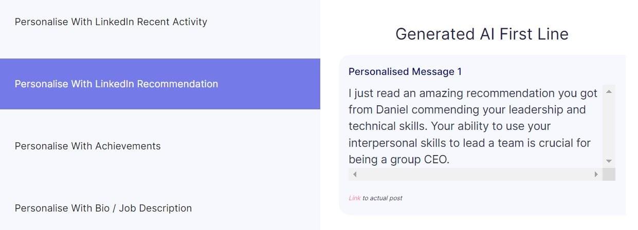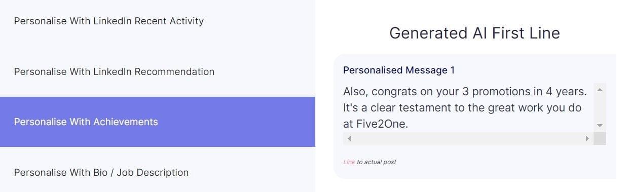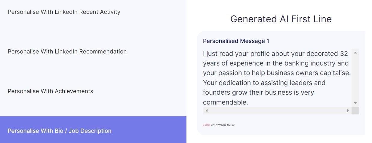 We find unique points from your prospect's LinkedIn bio, job profile or posts & create a complimenting personalized message